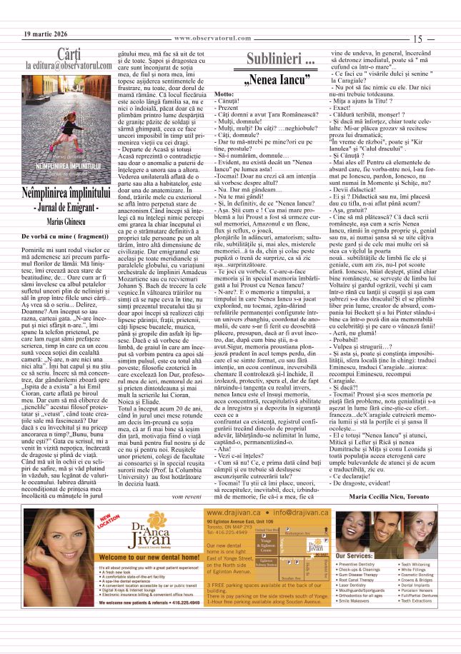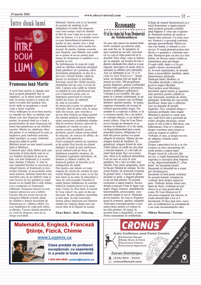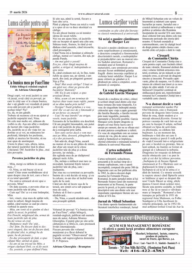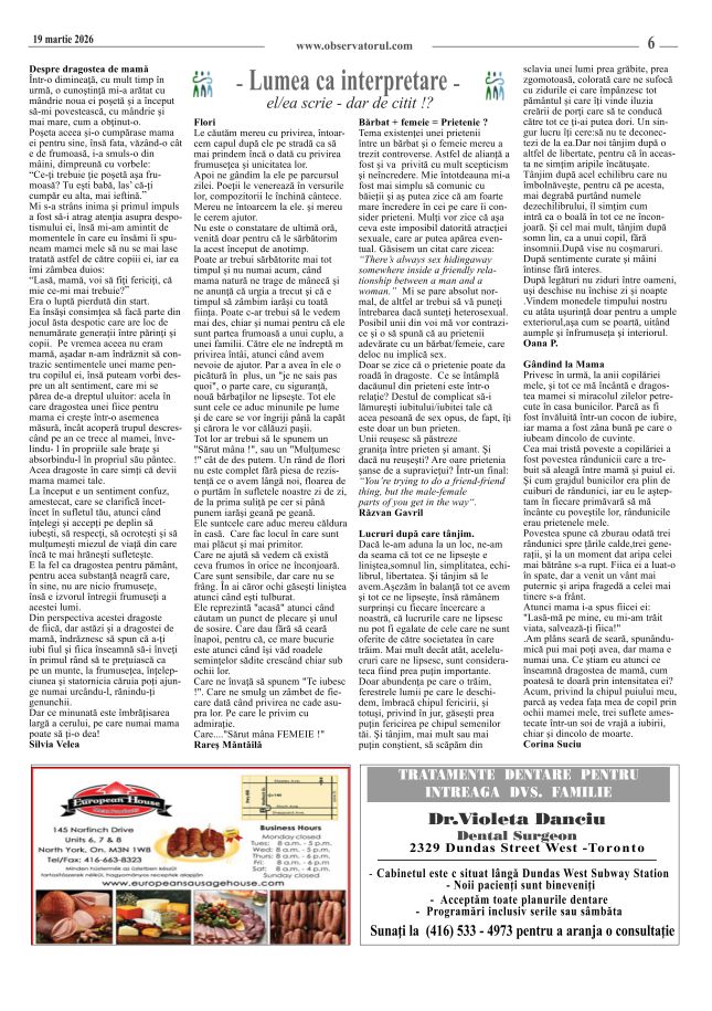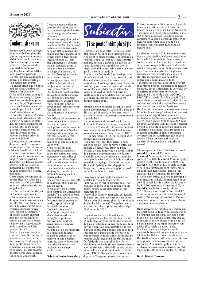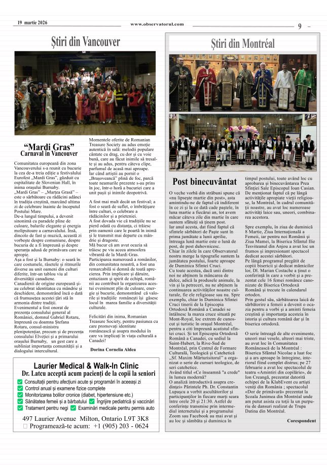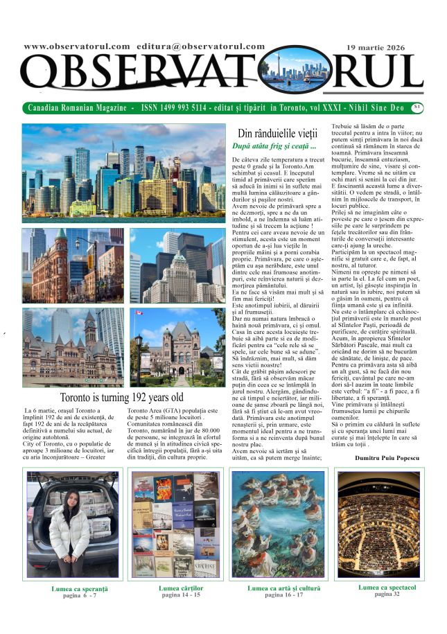3/18/2026, Observatorul editat si tipărit la Toronto, merge mai departe. Multumiri colaboratorilor, celor care incurajează si sprijină aparitia lui in continuare.