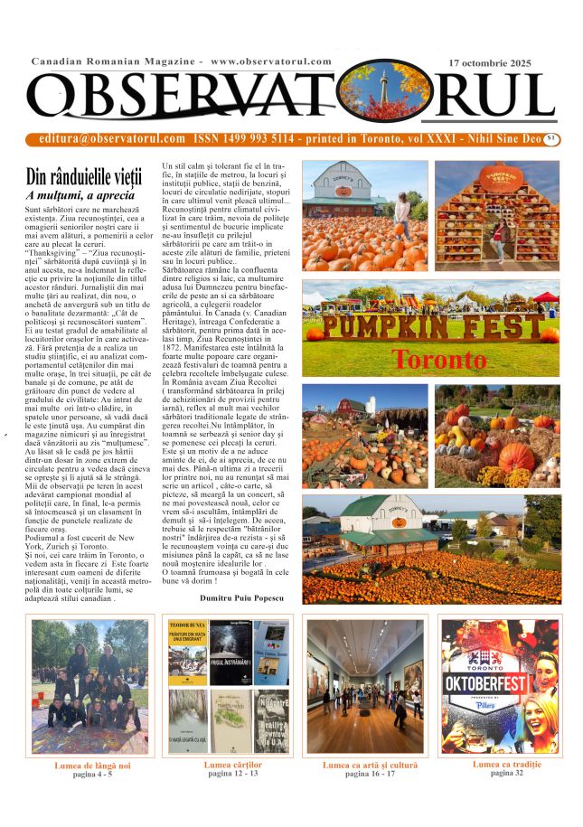 10/16/2025, De 30 de ani, Observatorul apare in același tiral și cu același număr de pagini. Observatorul se distribuie in 75 locuri in Toronto și GTA și prin Canada Post in Canada, România si alte tări - prin abonamente