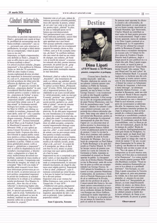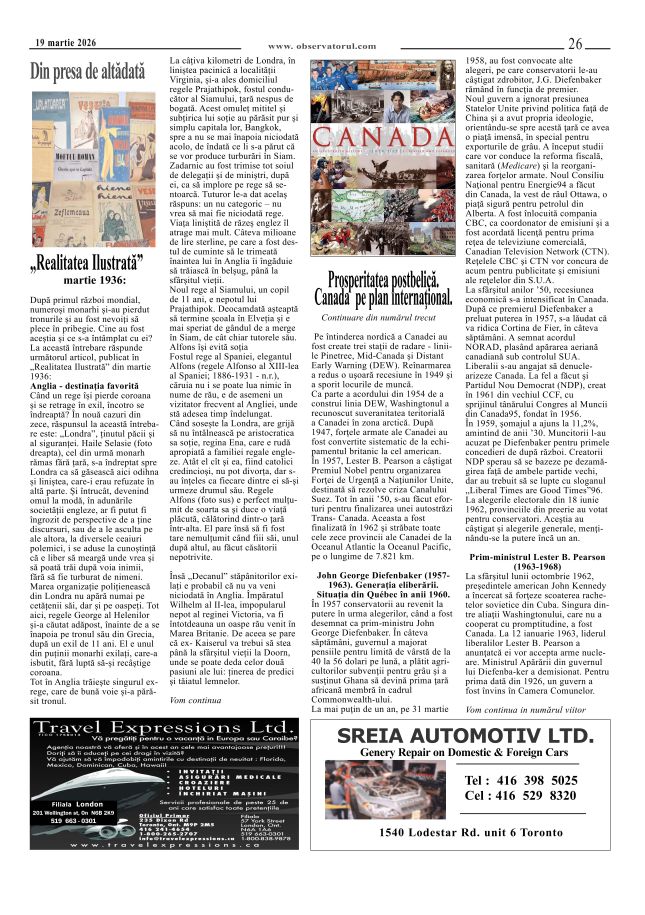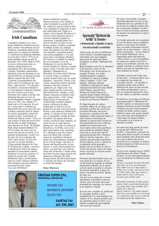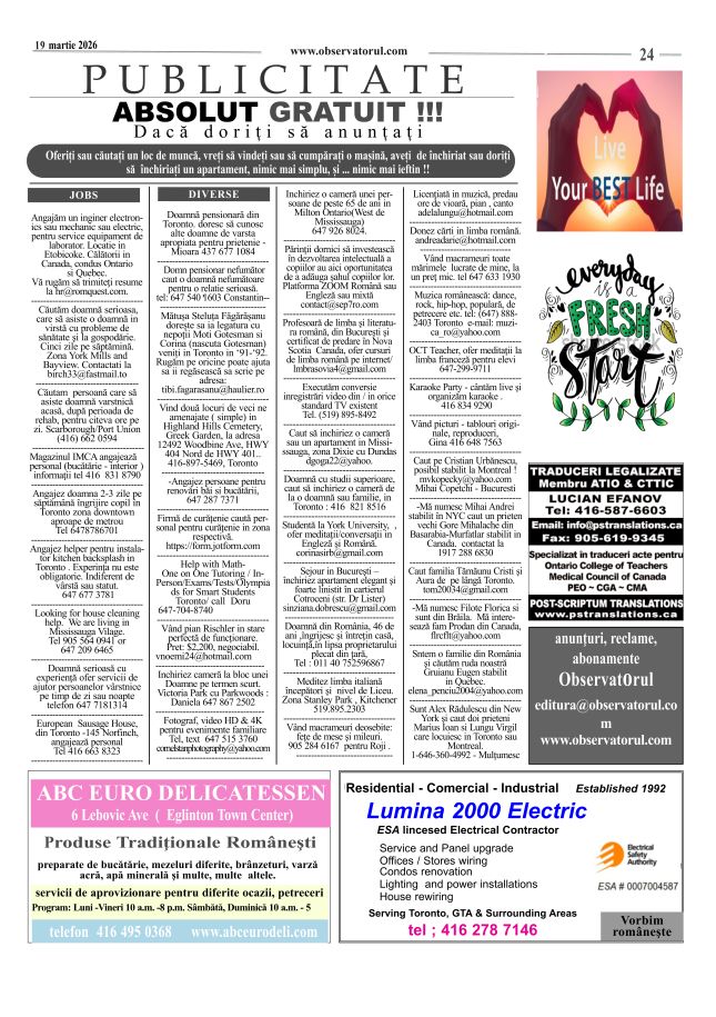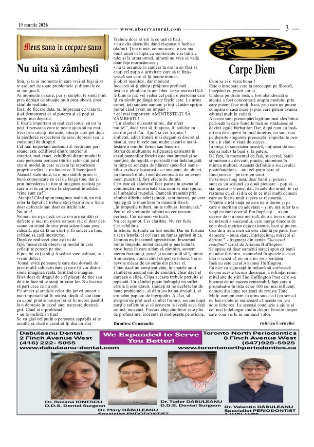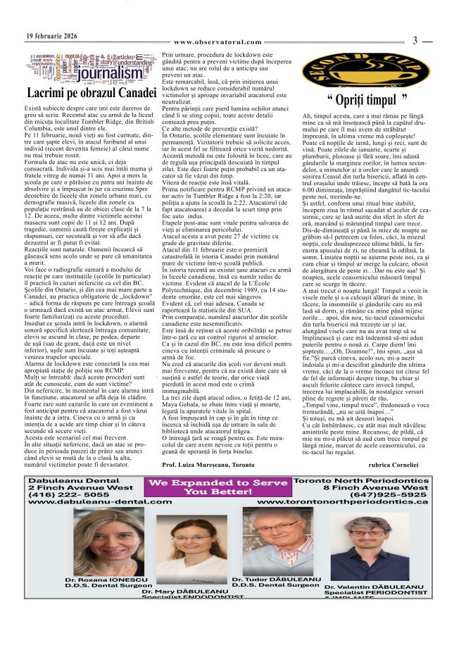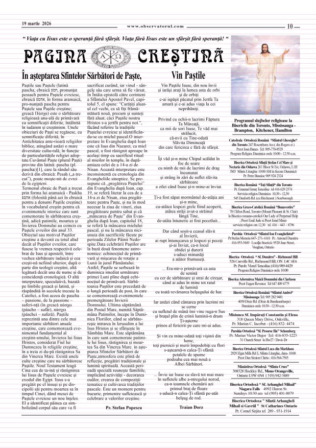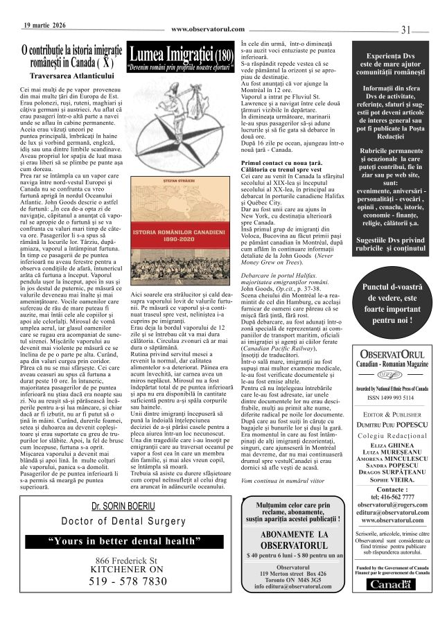 3/18/2026, Observatorul editat si tipărit la Toronto, merge mai departe. Multumiri colaboratorilor, celor care incurajează si sprijină aparitia lui in continuare.