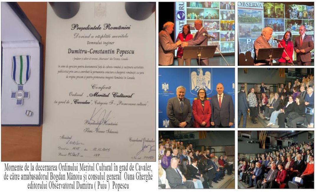 12/2/2004, Aniversare la Observatorul In sala spatiosa a tipografiei Centra Web din Toronto in care se tiparesc ziarele in multe limbi ale globului pamantesc, ne-am intalnit colaboratorii si prietenii cenaclului „Observatorul”. Sala mare cu care suntem familiarizati mai demult, desi plina de masini, isi are pulsul ei de viata si noua ne vorbeste in graiul ei. Decoratia tipografiei era cea de sarbatoare. Baloturile si sulurile uriase de hartie ne-au starnit imaginatia de a le folosi in buna masura ca decor. Din ele s-a alcatuit masa de prezidiu, a fost afisata o expozitie cu fotografii si reproduceri de harti si documente ale momentului Unirii din 1918 , precum si a evenimentelor premergatoare. Erau 120 de imagini de la Alba Iulia si Bucuresti, copii dupa acte si decrete din vremea respectiva, harti ale Basarabiei si Transilvaniei. Pe alte baloturi erau carti de istorie, cartile nou aparute, reviste, Intr-un colt , parca simteai ca ceva te cheama si te invaluie o calda lumina, era amenajat „coltul” romanesc, iar langa el, asa cum ii statea bine, cel canadian. Obiecte din Romania – vase de ceramica, costume populare, cergi, imagini din Romania, ne vorbeau cu caldura, iar cele canadiene parca ne intindeau bratule sa ne cuprinta. Erau afisate harti cu ROMANIA MARE , steaguri romanesti, iar pe masa „prezidentiala” painea cea cunoscuta din stramosi, facuta de seniorul colectivului, d-l Ovidiu Creanga, paine facuta in vatra, si purtand cele doua steaguri ale celor doua tari ce le purtam in suflet, Romania si Canada. Alaturi de paine era un vin special, trimis de pe pamantul frant din trupul Romaniei, din Basarabia cea plina de suferinta si acum de mari framantari. Scriitorul si poetul Iurie Colesnic care ne-a onorat cu prezenta in luna trecuta, ne-a trimis acest vin ca sa simtim gustul pamantului din trupul frant tarii noastre. Dupa ce participantii au consultat interesantele materiale afisate, dupa ce au schimbat impresii unii cu altii, bucurandu-ne, nu numai de regasirea intre noi, dar si de prezenta prietenoasa a d-lui Consul General Nicador Teculescu, s-a inceput programul propru-zis. Deschiderea a facut-o d-l Dumitru Popescu anuntand programul. La prezidiu au luat loc veteranii grupului nostru : D-l Nicolae Suciu, D-l Ovidiu Creanga, D-l Petre Suba si d-l prof. Silvestru Moraru. Veteranii nostri s-au prezentat pe rand.; D-l Constantin Suciu, venit in Canada de 35 de ani, din Rupea, de langa Brasov, nepot din celebra familia Suciu care a facut parte din comitetul de initiativa la 1 Decembrie 1918, din Transilvania, aviator in al doilea razboi mondial, decorat pentru fapte de vitejie, ne-a povestit evenimente pe care le-a trait in timpul razboiului. El ne-a adus ordine si medalii si o harta a fostei Daciei. D-l Petre Suba, venit din 1948 in Canada, ne-a relatat pe scurt viata plina de multe framantari, dar si de multe satisfactii din lumea noua. E un roman ce a pastrat o adevarata comoara de valori spirituale si care daruieste $1.000 pentru o slujba in memoria victimilor comunismului. Despre D-na si D-nul Suba a scris recent cu deosebite elogii si ziarul de limba engleza „The Mirror” din Toronto. D-l Ovidiu Creanga, Mos Bodranga al nostru, cel hatru si plin de glume, nascut pe pamant basarabean, animat de lupta pentru a sprijini Basarabia, cu un suflu tanar, desi ne marturiseste ca are 83 de ani, a indemnat asistenta sa fie de acord cu o adeziune de sustinere a fratilor nostri de dincolo de Prut care in aceste zile lupta impotriva federalizarii tarii si a apropierii de Rusia. D-l prof. Silvestru Moraru ne-a vorbit despre actul Unirii, dar mai ales de momentele pregatitoare. Ca profesoara, tare mi-ar fi placut sa fie prezenti elevii mei de la scoala. Nici o lectie de istorie nu ar fi fost mai clara si nici una nu le-ar fi dat mai multe cunostinte, decat prezenta la acest cenaclu. Cu o voce foarte bine timbrata, blana si seducatoare, mai mult vorbind decat citind, cu argumente logice si cu o foarte buna documentare, ne-a dat impresia ca suntem intr-o aula universitara, caci nu de putine ori, gandul ne-a trimis acolo in timp ce il ascultam. Cu totii l-am urmarit cu mult interes. Au fost si cateva momente deosebit de emotionante. Pe muzica “Ruga pentru Timisoara” si „Pune tata steag la poarta” in interpretarea lui Tudor Gheorghe, s-a purtat momente de reculegere in memoria eroilor neamului romanesc.. Cu totii am rostit rugaciunea „Tatal nostru”. Veteranii nostri au aprins fiecare cate o lumanare intr-un sfesnic si acestea au ars in tot timpul intrunirii noastre. Pentru ziua Romaniei am cantat imnul national. Ne-au recitat din creatiile lor dedicate unirii ; D-l Ion Segarceanu doua poezii si D-l Stelian Ilie Constantin iar D-na Veronica Lerner Pavel o frumoasa oda pentru limba romana.. Ca de fiecare data, D-l Dumitru Popescu a facut prezentarea cartilor si revistelor primite la „Observatorul”. A fost prezentat si Sasi Vuscan, tanarul compozitor si muzician, fondator al grupului Jais din Timisoara, venit de curand in Canada. Sasi va lansa aici in Toronto, noul lui CD –"Transylvanian christmas songs" melodii ascultate in premiera de cei prezenti. Si ca de fiecare data, cenaclul nostru s-a incheiat cu bunatati stropite cu vinuri romanesti. S-a cantat multi ani pentru cei nascuti in luna Decembie ; Stelian Ilie si Doamna Medan. Am cantat colinde romanesti si din Basarabia, D-l si D-na Medan fondatorii corului”Armonia” fiind initiatorii si solistii corului ad-hoc. Ziua de 1 Decembrie, ziua nationala a tarii noastre, a fost si pentru noi o sarbatoare, chiar daca ne aflam peste mari si tari. Dar distanta in spatiu, nu inseamna si distanta in suflet. Iubim si noua noastra tara care ne-a primit cu bratele deschise si pentru care nu contam numai din punct de vedere contabil, dar nu ne desprindem nici de Tara-Mama. Ziua de 1 Deecembrie poarta aura unei zile de mare gratie, care a dat nastere unor sentimente coplesitoare. Ea este aleasa ca ziua nationala a Romaniei car