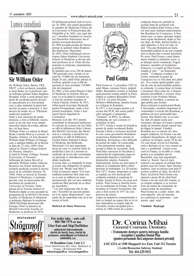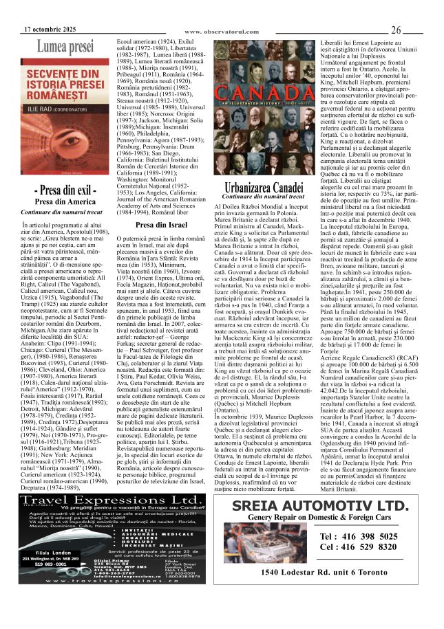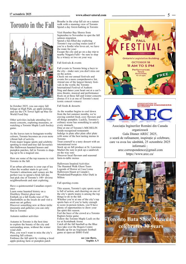 10/16/2025, De 30 de ani, Observatorul apare in același tiral și cu același număr de pagini. Observatorul se distribuie in 75 locuri in Toronto și GTA și prin Canada Post in Canada, România si alte tări - prin abonamente