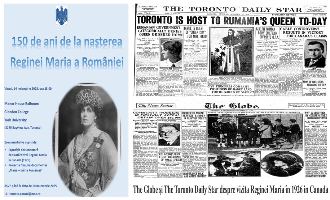 11/15/2025, O expozitie de documente care au readus în atenție vizita istorică a suveranei din 1926 în Canada si filmul documentar ; Maria - Inima României Evenimentul a avut loc la Glendon Campus, York University Toronto