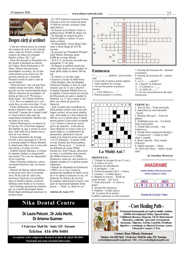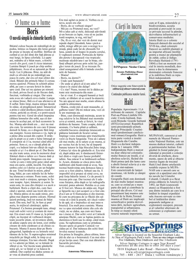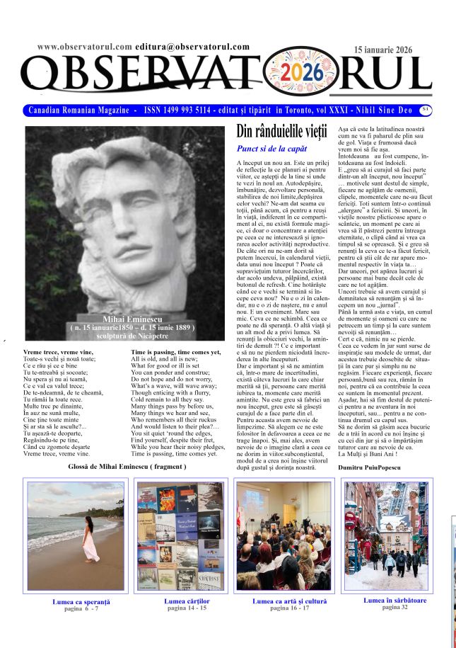 1/25/2026, Editura Observatorul iși doreste sa promoveze cărti și autori pentru cunoasterea și răspândirea culturii românești contacte; editura@observatorul.com observatorul@rogers.com