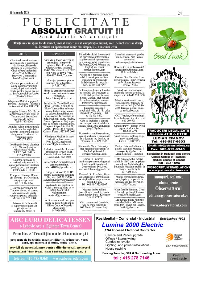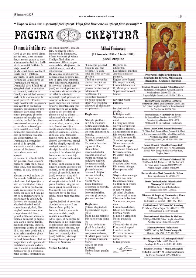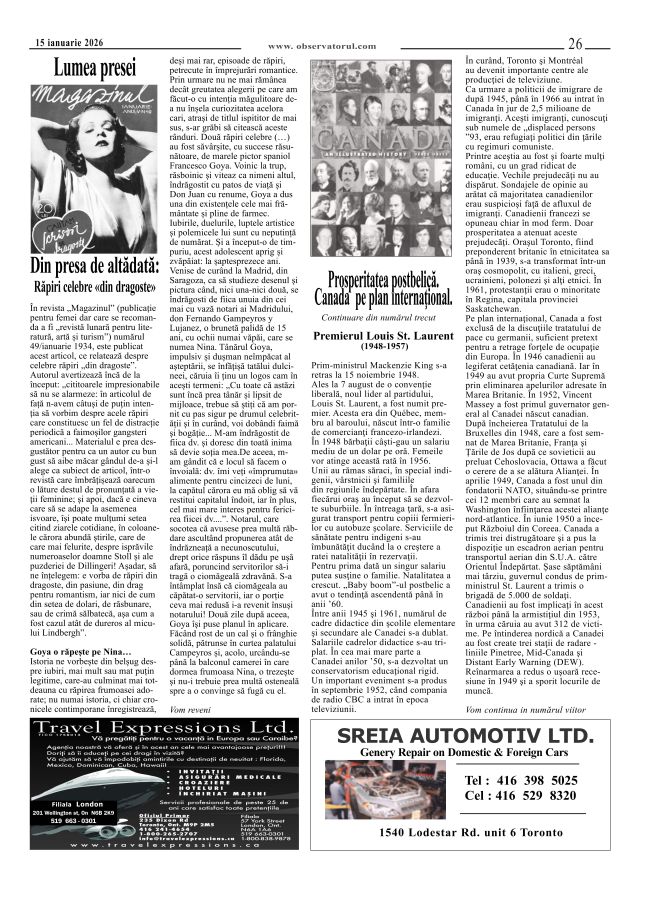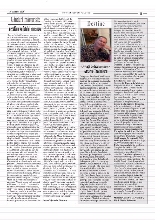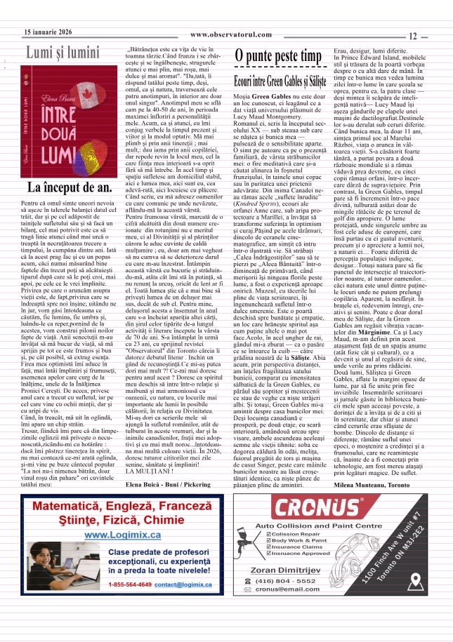1/14/2026, O nouă editie a Observatorului, editat si tipărit la Toronto Multumiri celor care colaborează si incurajează aparitia in continuare a Observatorului