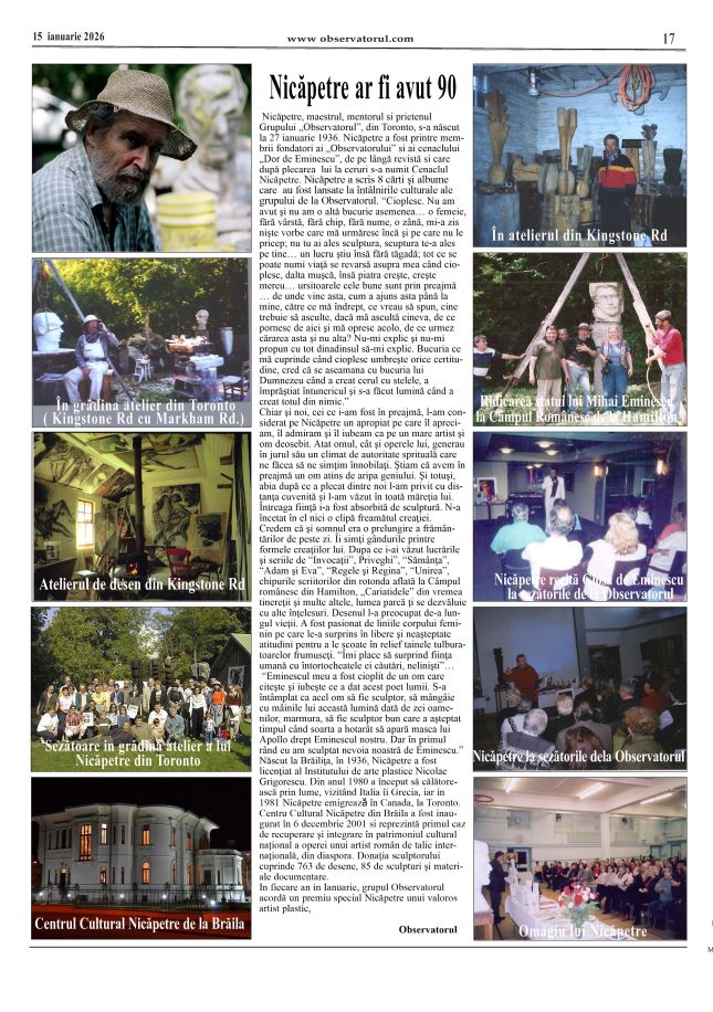 1/31/2026, Marele artist Nicăpetre, mentorul si prietenul Grupului „Observatorul”, ar fi implinit in acest ianuarie 90 Nicăpetre a fost printre membrii fondatori ai „Observatorului” si ai cenaclului „Dor de Eminescu”, de pe lângă revistă si care după plecarea lui la ceruri s-a numit Cenaclul Nicapetre.