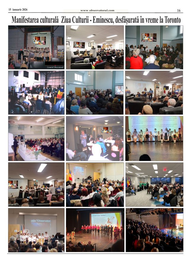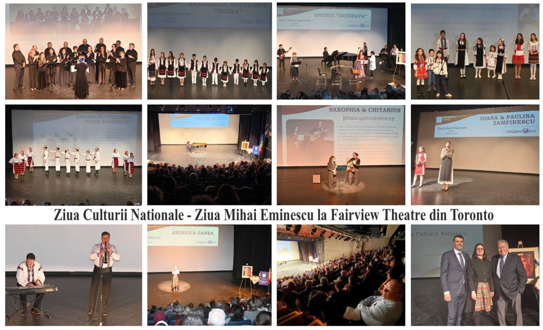1/21/2026, Ziua Culturii Române - Ziua Eminescu sărbătorită la Toronto printr-un spectacol organizat de Consulatul General al României si grupul Observatorul. Într-o sală de peste 300 de locuri - o intâlnire dintre generații, artiști și prieteni ai culturii române. Un program cu poezie, momente muzicale, traditii - dansuri populare